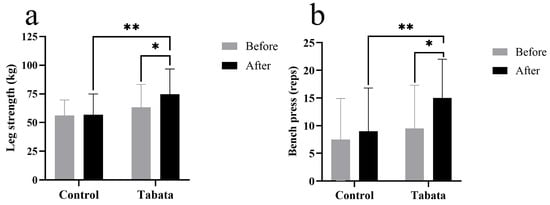 Leg muscle strength (a) and arm muscle endurance (bench press) (b) of participants in control and Tabata groups before and after 12-week intervention. *: p < 0.05 vs. before intervention, **: p < 0.05 vs. control group.
