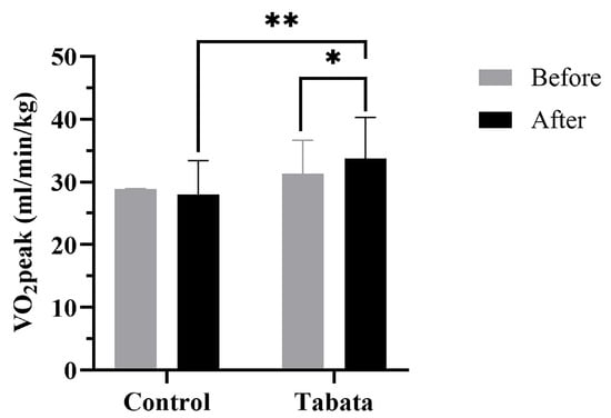 Peak oxygen consumption (VO2peak) of participants in control and Tabata groups before and after 12-week intervention. *: p < 0.05 vs. before intervention, **: p < 0.05 vs. control group.