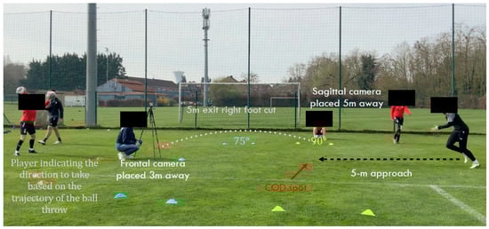 COD mechanics were assessed using the Cutting Movement Assessment Score (CMAS), a validated qualitative tool for evaluating movement patterns related to ACL injury risk [27]. Testing was performed at three different angles: 45°, 75°, and 90°. Each participant performed 3 trials per direction (left and right) for each COD angle, totaling 18 recorded trials per player.