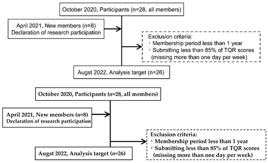 The study monitored TQR, a subjective recovery scale, daily for 36 competitive swimmers from a single university swim team over two seasons (99 weeks) between October 2020 and August 2022. Participants were recruited during team meetings, and all swimmers volunteered. The study focused on 22 swimmers who had been members of the team for at least one season during the monitoring period and had a submission rate of TQR score above 85% (missing no more than 1 day per week) (Figure 1). Some swimmers participate in approximately 10 races in a season [32].