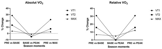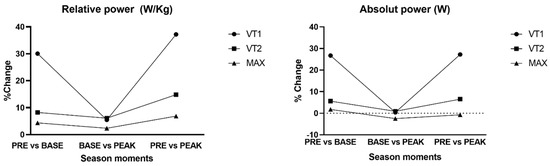 The percentage of change in power output is expressed in Figure 1, showing relative power and absolute power through the season’s time points. Power output changes are more visible in relative power output (Wr) based on the changes in body composition. Power output in ventilatory threshold 1 increases much more between pre and base than between base and peak. In ventilatory threshold 2 and maximum oxygen uptake, changes remain constant throughout the measures.