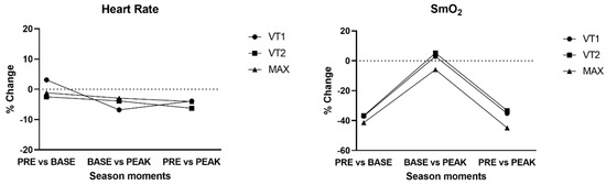 Heart rate and muscle oxygen saturation (SmO2) % Change between season time points.