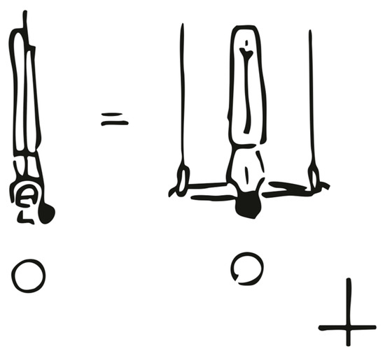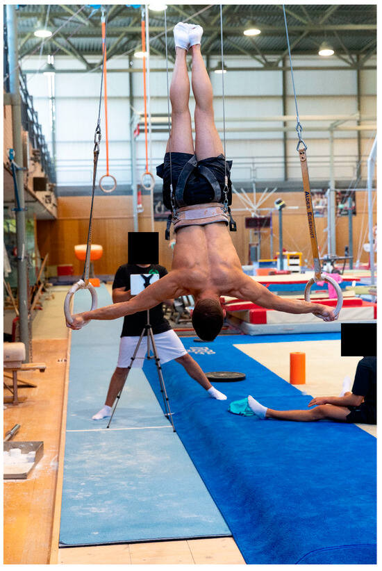 Maximum strength was determined for the “Inverted Cross on Rings” element (Figure 1) using a pulley system with counterweight to facilitate the exercise. The holding position had to be achieved by lowering from Handstand into “Inverted Cross on Rings”. Maximum strength was defined as the maximum resistance that could be held for five seconds (bodyweight—counterweight). The counterweight was selected to match the individual’s strength level allowing each to hold the static position accurately for a maximum of five seconds. In the first attempt, the athletes had to hold 50% of their body weight (rounded to 2.5 kg) for 3 s. Where the load was perceived as light or very light, the counterweight for the second attempt, which was held for 5 s, was reduced by 2.5 or 5 kg, respectively. Further attempts were made according to this method until the athlete was able to hold the position for precisely 5 s. Between two attempts, athletes had three to five minutes recovery. Preliminary trials during training two days before the tests helped the athletes to define their approximate counterweight.