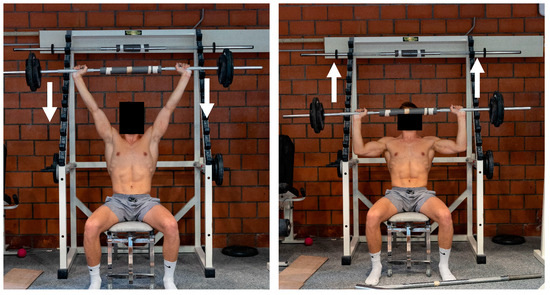 To assess the 1RM of the “Seated Overhead Barbell Press” exercise, the athlete was seated on a bench with a backrest fixed at a 70° angle, which was placed inside a barbell rack. The bar was lifted from the rack with the help of a coach to the starting position (arms straight up). The bar was then lowered to a position where the elbows were at a 90° angle and pushed back to the starting position. The barbell grip width was set so that in the bottom position the upper arms were horizontal and the forearms were vertical (Figure 3, right). In the initial trial, the movement was executed three times with a load equivalent to 50% of the athlete’s body weight (rounded to 2.5 kg). If the load was perceived as light or very light, the weight was increased by 5, 10 or 20 kg in the following one-repetition attempt. For the following attempts, the weight was adjusted individually. In this way, all athletes reached their 1RM in a maximum of five attempts, the maximum number of attempts used in other studies [7]. Athletes had a five-minute break between attempts in order to recover completely.
