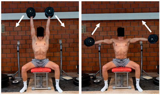 The 1RM of “Inverted Cross with Dumbbells” exercise was determined seated on a bench. With the help of a coach, the dumbbells were raised to the starting position (arms abducted to a vertical position). The fully extended arms were then lowered laterally to a horizontal position before returning to the starting position. During execution, the elbows remained extended and the upper body was allowed to lean backwards by a maximum of 20° during the concentric movement phase (Figure 4). In terms of repetitions and rest periods, this test was identical to the “Seated Overhead Barbell Press”. For the initial attempt, the weight of the dumbbells corresponded to 15% of the body weight. For the subsequent attempts, the load was increased by 2 kg, respectively 4 kg. The dumbbell weight in the further attempts was increased individually.