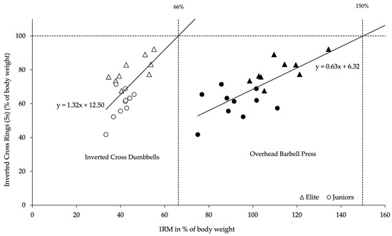 Preparatory strength benchmarks as a percentage of body weight: Linear regression analysis between maximum strength in the “Inverted Cross on Rings” and the 1RM of the conditioning exercises “Inverted Cross with Dumbbells” (left) and “Seated Overhead Barbell Press” (right) (Elite athletes: n = 9; Junior Athletes: n = 10).