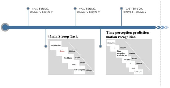 The experimental results primarily included descriptive statistics of reaction time (RT) and accuracy (ACC) in the Stroop paradigm, BRUMS-C scale recordings of the BRUMS-F (fatigue) and BRUMS-V (vitality) subdimensions, one-way ANOVA of VAS and Borg-20, descriptive statistics of time perception prediction for action recognition and motion decision making, and three-factor repeated measures ANOVA. Before conducting the repeated measures ANOVA, we tested the assumptions of normality and sphericity. Normality was assessed using the Shapiro–Wilk test, and sphericity was tested using Mauchly’s test. In case of violations of sphericity, we applied the Greenhouse–Geisser correction. Additionally, homogeneity of variance was tested using Box’s test. To provide a comprehensive understanding of the effect sizes reported in our study, we have included the interpretation thresholds for the partial eta-squared (η2) values. According to commonly accepted guidelines, η2 values can be interpreted as follows: a small effect size (η2 = 0.01) indicates a weak relationship between variables, which may not be very significant in practical applications; a medium effect size (η2 = 0.06) indicates a moderate relationship between variables, which is usually detectable through data analysis; and large effect size (η2 ≥ 0.14) indicates a strong relationship between variables, which is typically very evident and has practical significance [30]. Data analysis and processing were conducted using SPSS software (version 26.0), and GraphPad Prism 8 (GraphPad Software Inc., San Diego, CA, USA) was used for data visualization.