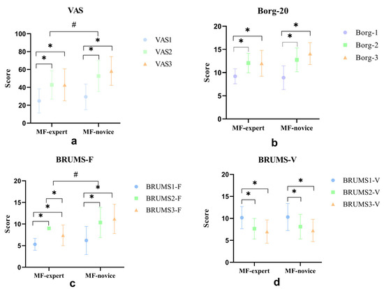 VAS, Borg-20, BRUMS-F, and BRUMS-V scale scores for MF expert group and MF novice group. * indicates a significance level of 0.05. “#” indicates that there is a significant difference between the MF-expert group and the MF-novice group. (a) VAS scores of expert and novice groups at three time points in mental fatigue; (b) Borg-20 scores of expert and novice groups at three time points in mental fatigue; (c) BRUMS-F scores of expert and novice groups at three time points in mental fatigue; and (d) BRUMS-V scores of expert and novice groups at three time points in mental fatigue.