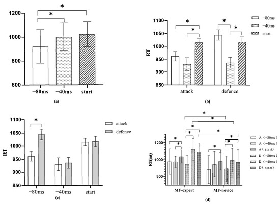 In terms of time blocking, a significant difference in offensive and defensive techniques was observed at −80 ms (p < 0.05), with no significant difference at −40 ms (p > 0.05). Under the action initiation conditions, no significant differences in offensive and defensive techniques were found (p > 0.05). This suggests that there is a difference in RT between offensive and defensive techniques at −80 ms, with offensive techniques having shorter action recognition times.