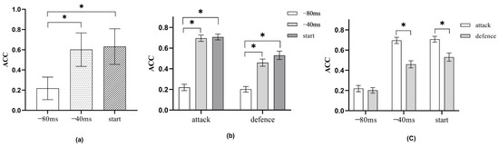 Multiple comparison results for time shielding revealed a significant difference between level 1 (−80 ms) and level 2 (−40 ms) of factor C, with ACC at −40 ms being higher than ACC at −80 ms (p = 0.000, p < 0.05). There was also a significant difference between levels 1 (−80 ms) and 3 (action initiation), with the ACC at action initiation being higher than that at −80 ms (p = 0.000, p < 0.05). No significant difference was observed between levels 2 and 3, indicating no difference between the ACC at −80 ms and the ACC at action initiation (p = 0.380, p > 0.05).