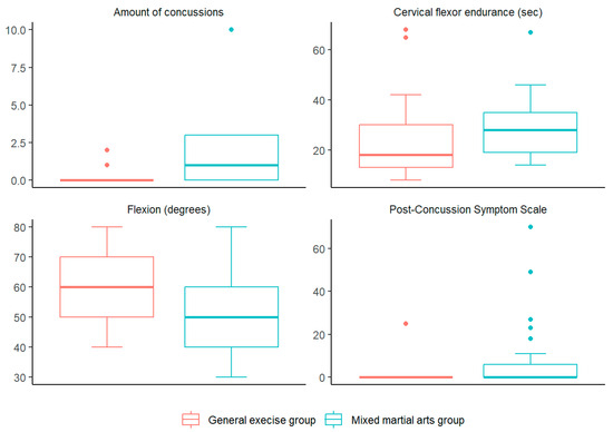 A total of 50 subjects with an average age of 27.80 ± 5.46 participated in the study, with a predominance of men (72.0%), with no socio-demographic differences between the two groups. Participants in the MMA group reported an average of 9.28 h of training per week, far exceeding the minimum inclusion threshold. On the other hand, the presence of significant differences was verified in the clinical variables Amount of concussions, Post-Concussion Symptom Scale, Cervical flexor endurance (s) amount of concussions (Z = −3.294, p < 0.001), Post-Concussion Symptom Scale (Z = 2.521, p = 0.012), and cervical flexor endurance (Z = 2.156, p = 0.031) with higher values in the Mixed martial arts group [1.68 (0.539, 2.821), 7.2 (−0.262, 14.662), 5.12 (−3.109, 13.349) points of difference compared to the general exercise group, respectively], while in the variable Flexion (°) (Z = −2.156, p = 0.031), the values were lower in the Mixed martial arts group [−8 (−15.37, −0.63) points of difference compared to the general exercise group (Table 1, Figure 1).