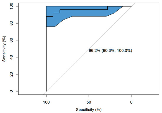The model had a sensitivity of 92% and a specificity of 92%. The ROC curve showed a significant 96.16, 95% CI (90.276%, 100%) (Figure 2).