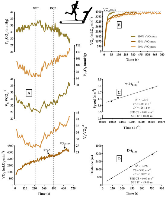 where v = running speed; D′ = amount of work from bioenergetic reserves; t = the time limit (tLim) of predictive trials; and CS = critical speed. The VO2 corresponding to CS was determined using the trend relationship between VO2 and running speed during the incremental test [7,30].