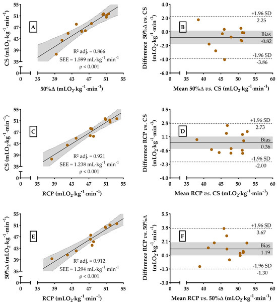 Dispersion and Bland–Altman plots for VO2 values at CS, RCP, and 50%∆. Dispersion between VO2 at 50%∆ vs. CS (99.9% power, Panel (A)), VO2 at RCP vs. CS (99.9% power, Panel (C)), and VO2 at RCP vs. 50%∆ (99.9% power, Panel (E)). Agreements analysis between VO2 at 50%∆ vs. CS (Panel (B)), RCP vs. CS (Panel (D)), and RCP vs. 50%∆ (Panel (F)). The gray area in all the panels represents the 95% confidence interval.