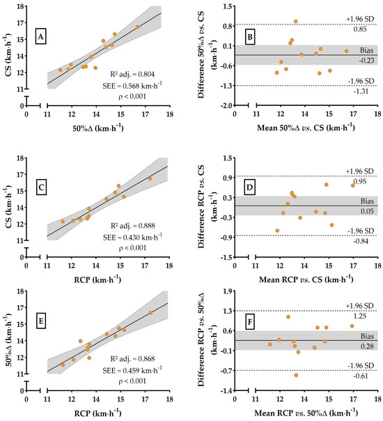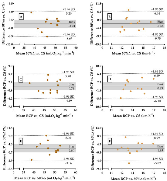 Dispersion and Bland–Altman plots for speed (km∙h−1) values at CS, RCP, and 50%∆. Dispersion for 50%∆ vs. CS (99.4% power, Panel (A)), RCP vs. CS (99.9% power, Panel (C)), and RCP vs. 50%∆ (99.9% power, Panel (E)). Agreements analysis between velocities at 50%∆ vs. CS (Panel (B)), RCP vs. CS (Panel (D)), and RCP vs. 50%∆ (Panel (F)). The gray area in all the panels represents the 95% confidence interval.