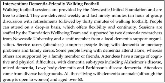 64. MacRae, R.; Macrae, E.; Carlin, L. An Evaluation of the Social Impact of a Pilot Dementia-Friendly Walking Football Programme; University of the West of Scotland: London, UK, 2020. [Google Scholar]