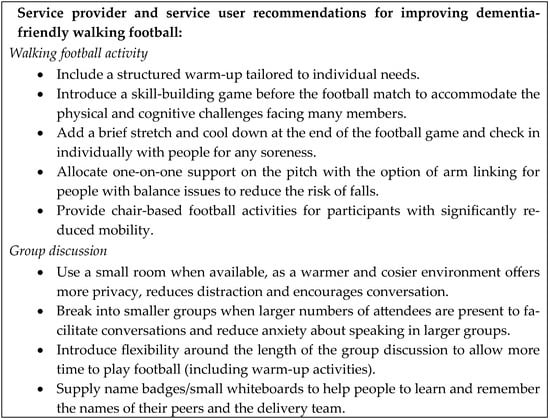 Figure 2. Recommendations for improving dementia-friendly walking football.