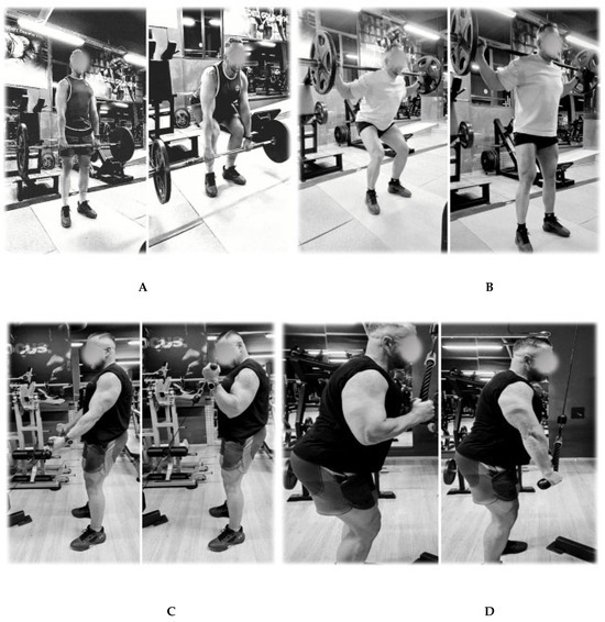 The gym protocol consists of 6 RT exercises: back squats, bench presses, deadlifts, biceps curls, triceps extensions, and pull-ups (Figure 1).