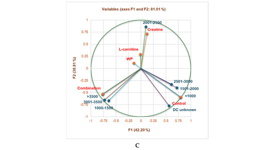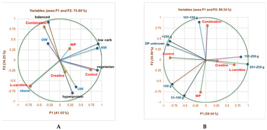No NS consumption was significantly correlated with a vegetarian diet (r = 0.953, p < 0.05), while combination strongly correlated with a balanced diet (r = 0.966, p < 0.05, Figure 2A). L-carnitine was considerably associated with obese gym-goers and 151–200 g protein/day (r = 0.999, r = 0.930, p < 0.05, Figure 2A,B). Moreover, the combination substantially correlated with 3001–3500 and >3500 calories/day (r = 0.975, r = 0.999, p < 0.05), creatine was appreciably associated with 2001–2500 calories/day (r = 0.970, p < 0.05), while <1000 calories/day highly correlated with no NS consumption (r = 0.999, p < 0.05, Figure 2C).