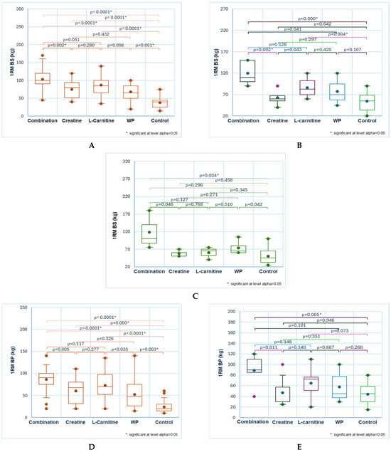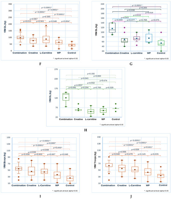 In the exercises for the biceps and triceps, only 1RM induced by combination, creatine, and L-carnitine are significantly higher than control: 55 ± 15, 46 ± 16, 45 ± 11 vs. 27 ± 12, p < 0.05 and, respectively, 64 ± 14, 55 ± 14, 51 ± 14 vs. 34 ± 11, p < 0.05 (Figure 3I,J). At the same time, the combination acts significantly higher than WP: 55 ± 15 vs. 37 ± 14, p < 0.05, and 64 ± 14 vs. 44 ± 16, p < 0.05 (Figure 3I,J).