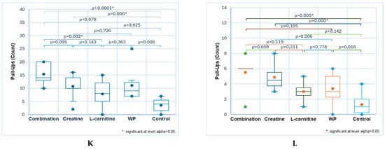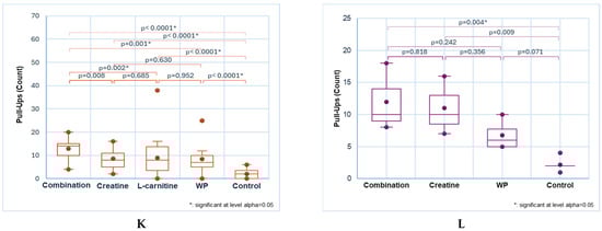 Substantial differences can be observed in pull-ups regarding NS consumption vs. control: 13 ± 4, 9 ± 4, 9 ± 8, 8 ± 6 vs. 2 ± 2, p < 0.05 (Figure 3K). Moreover, statistically significant differences occurred between combination vs. creatine and WP: 13 ± 4 vs. 9 ± 4 and 8 ± 6, p < 0.05 (Figure 3K).