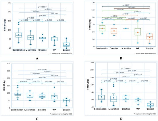 In back squat exercises, all NS led to 1RM values significantly different than control in the following decreasing order: combination, L-carnitine, creatine, and WP—103 ± 26, 87 ± 31, 75 ± 23, 68 ± 24 vs. 38 ± 15 (p < 0.05, Figure 3A). Moreover, significant differences can be reported between the combination and creatine and WP (103 ± 26 vs. 75 ± 23 and 68 ± 24, p < 0.05, Figure 3A).