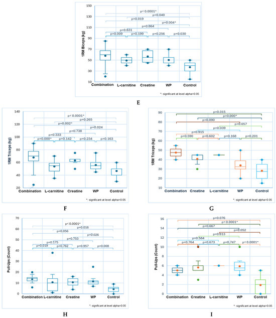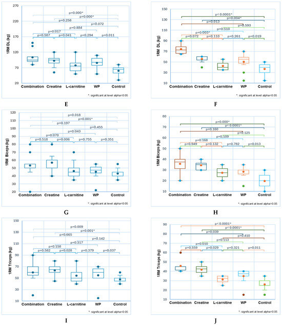 In the biceps exercise, the combination and creatine demonstrated significantly more potent effects than the control: 58 ± 13 and 57 ± 12 vs. 37 ± 11, p < 0.05 (Figure 4E). The combination’s effects are also remarkably greater in the triceps compared to control, WP, and L-carnitine: 68 ± 13 vs. 47 ± 10, 56 ± 9, and 54 ± 11, p < 0.05 (Figure 4F). For females, creatine records significantly differ from control: 48 ± 11 vs. 28 ± 8, p < 0.05 (Figure 4G).