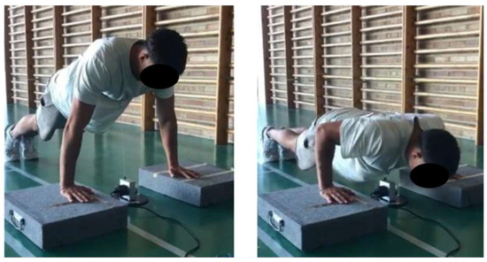 The push-press is a global exercise that involves the lower and upper limbs in explosive movement. The subjects were instructed to perform the correct technique that was described previously by the National Strength and Conditioning Association [27] (Figure 2). In push-press exercise execution, speed is a critical factor, as the rapid activation of muscles and their precise coordination are necessary to generate maximum force in the shortest possible time [28].