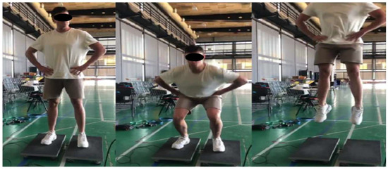 The subjects performed 3 maximal countermovement jumps. The subjects were asked to start the movement in an upright standing position with their hands on their hips. When they were ready, they dropped to volitional depth and jumped as high as possible. All jumps were performed with their hands held on their hips to limit any upper extremity influence on the jumps. CMJ performance was analyzed using a calibrated force plate (Forcedecks 4000, Vald Performance, VIC, Australia) (Figure 4).