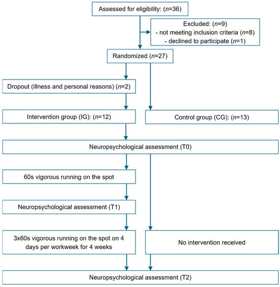 A randomized pre- and post-test design was employed to evaluate (1) acute effects of a single bout of 60 s of running on the spot on CP within the intervention group (IG) and (2) the chronic effects of 4 weeks of ESs, comprising 60 s of running on the spot, 3 times a day for 4 days per week of the IG, in comparison to a control group (CG) receiving no intervention (Figure 1). Depending on group allocation, participants underwent either two (CG) or three (IG) neuropsychological assessments. On the initial testing day (T0), participants in both groups completed the neuropsychological assessment to establish baseline values. In the IG, the 4-week intervention period commenced one week after T0. On the first day of the intervention period, participants in the IG completed the second neuropsychological assessment (T1) following a five-minute rest after the first ES to evaluate acute effects on CP [37]. Three days after the end of the 4-week intervention period, all participants underwent a final neuropsychological assessment (T2) to measure post-test values (chronic effect). Participants were instructed not to engage in physical activity prior to the final assessment to ensure that there was no interference from acute activation following physical exercise.