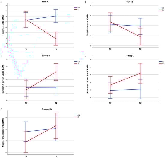 Estimated marginal means (EMMs) for all measures of cognitive performance for CG and IG at T0 and T2. (A) Trail Making Test Part A; (B) Trail Making Test Part B; (C) Stroop Word; (D) Stroop Color; (E) Stroop Color-Word. Error bars indicate ±2 SE.