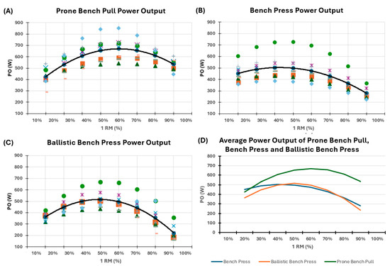 Figure 2 reports the individual and mean power output for the following exercises: Panel A, Prone Bench Pull; Panel B, Bench Press; Panel C, Ballistic Bench Press. Different individuals are represented with distinct symbols within the same Panel, but are constant between Panels; the black marked line of Panels A, B, and C represents the average power output. Finally, in Panel D, a graphical comparison of the mean power output across the three exercises is available. 1RM—One repetition maximum; %—Percentage; PO—power output; W—Watts.