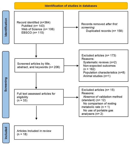 A total of 364 articles were initially retrieved from PubMed (n = 143), Web of Science (n = 106), and EBSCO (n = 115). After removing 158 duplicates, 206 unique studies proceeded to further screening by title, abstract, and keywords. A total of 173 studies were excluded based on predefined criteria: inappropriate study design (systematic reviews, n = 2), irrelevant outcomes (n = 162), animal studies (n = 1), and population characteristics misaligned with inclusion criteria (n = 8). Following this phase, 33 studies were entirely read, excluding 15 additional papers due to either the absence of a standard reference method or the lack of direct RMR assessment. Lastly, 18 studies met inclusion criteria and were included in the final analysis (Figure 1).