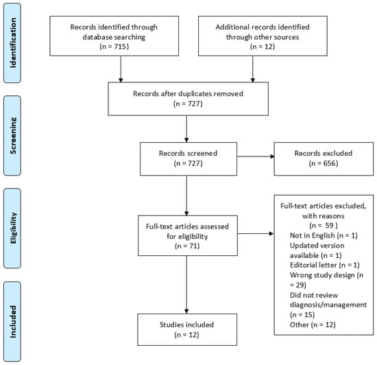 From 727 identified studies, two authors (SB and SM) independently screened titles and abstracts. Disagreements were resolved through discussion or by a third reviewer (NH). A full-text review was conducted on 71 articles. Reasons for exclusion included secondary care focus (1 article), inaccessible full texts (12 articles), not published in English (1 article), updated version published (1 article), editorial letter (1 article), or protocol (1 article). Additional exclusion reasons included a review or discussion paper (27 articles) or no review of diagnosis or management (15 articles). A total of 12 articles were included in this scoping review. A PRISMA flowchart (see Figure 1) summarises the process [28].