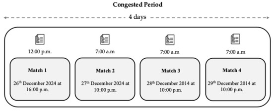 The present study was meticulously structured prior to the initiation of championship preparation, involving a comprehensive analysis of the entire training calendar to evaluate the evolution of well-being states resulting from four consecutive official matches during the Spanish U16 Autonomic Championship. It is worth noting that the team’s training sessions were held every Monday, which provided an opportunity for the players to become familiar with the well-being questionnaire. The matches adhered to the official regulations set by FIFA 2024, providing a consistent competitive environment (see Figure 1 for a visual representation of the match schedule). This careful planning aimed to provide meaningful insights into the athletes’ well-being dynamics throughout the tournament.