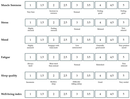Well-being questionnaire developed by McLean et al. [8]. This instrument is designed to assess various dimensions of well-being (muscle soreness, stress, mood, fatigue, sleep quality, and well-being index).