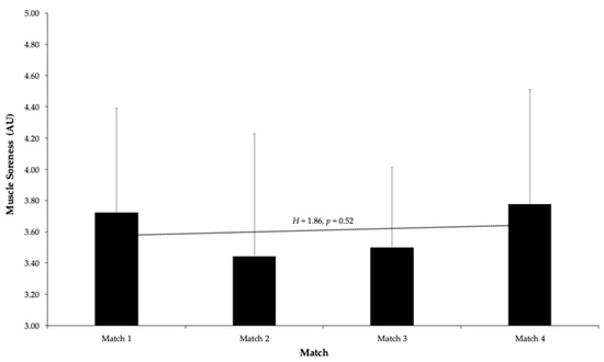 To assess whether these variations were statistically significant across the series, a Kruskal–Wallis H test was performed, yielding no significant differences (H = 1.86, p = 0.52). This suggests that players’ muscle soreness remained fairly consistent throughout the competition, possibly reflecting effective recovery strategies and adaptation to the physical demands.