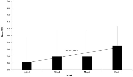 In terms of perceived stress, the scores demonstrated only slight fluctuations over the course of the matches. The average stress score was 3.22 ± 0.73 during Match 1, increasing modestly to 3.39 ± 0.78 in Match 2, remaining stable at the same level in Match 3, and rising again to 3.71 ± 0.57 in Match 4. A Kruskal–Wallis H test indicated no significant overall change in stress levels across the matches (H = 3.70, p = 0.21) (see Figure 4).