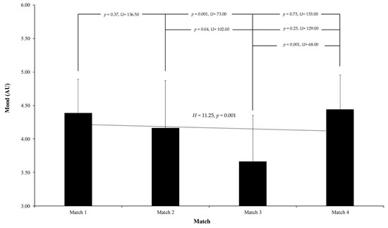 Mood levels demonstrated more pronounced fluctuations throughout the competition. The highest average mood score was recorded in Match 1 at 4.39 ± 0.50, indicating a generally positive emotional state at the outset. This score decreased in Match 2 to 4.17 ± 0.71, reached its lowest point in Match 3 at 3.67 ± 0.69, and then improved again in Match 4 to 4.44 ± 0.51. A Kruskal–Wallis H test revealed significant differences across the matches (H = 11.25, p = 0.001), confirming that mood states varied notably during the series. Pairwise Mann–Whitney U comparisons identified significant differences in mood levels between certain matches, specifically between Match 1 and Match 3 (p = 0.001, U = 73.00) and between Match 2 and Match 3 (p = 0.04, U = 102.00), suggesting notable emotional fluctuations during these periods. Conversely, other comparisons revealed no significant differences, such as between Match 1 and Match 2 (p = 0.37, U = 136.50), Match 1 and Match 4 (p = 0.75, U = 153.00), and Match 2 and Match 4 (p = 0.25, U = 129.00), indicating relative emotional stability before and after specific matches (see Figure 5).
