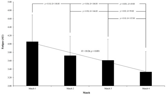 Regarding fatigue, the data indicate a progressive decrease in perceived fatigue levels over the series of matches. The average fatigue score was highest after Match 1 at 4.06 ± 0.64, decreasing to 3.72 ± 0.46 in Match 2, further declining to 3.61 ± 0.50 in Match 3, and reaching its lowest point in Match 4 at 3.33 ± 0.49. These results, supported by a Kruskal–Wallis H test (H = 10.24, p = 0.001), suggest that players felt progressively more rested and recovered as the competition advanced, possibly due to effective recovery routines or natural adaptation to the match demands. Post hoc pairwise comparisons revealed a general trend of decreasing fatigue levels across matches, with significant improvements in perceived energy and recovery observed between specific pairs: Match 1 and Match 4 (p = 0.001, U = 69.00), Match 1 and Match 3 (p = 0.04, U = 104.00), and Match 2 and Match 4 (p = 0.02, U = 99.00). These findings suggest meaningful reductions in fatigue as the competitive period progressed. Conversely, comparisons between Match 1 and Match 2 (p = 0.10, U = 118.00), Match 2 and Match 3 (p = 0.50, U = 144.00), and Match 3 and Match 4 (p = 0.10, U = 117.00) did not reach statistical significance, indicating that fatigue levels remained relatively stable during these intervals (see Figure 6).