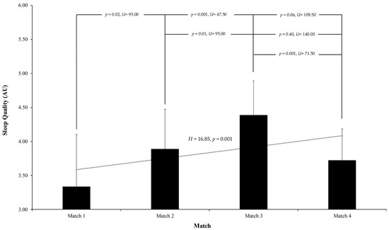 The analysis of sleep quality across the matches demonstrated significant temporal variations. A Kruskal–Wallis test indicated notable differences in perceived sleep quality (H = 16.85, p = 0.001). Post hoc pairwise comparisons revealed that sleep quality was significantly lower in Match 1 compared to Match 2 (p = 0.02, U = 95.00) and Match 3 (p = 0.001, U = 47.50). Additionally, a significant improvement was observed from Match 2 to Match 3 (p = 0.01, U = 95.00). Conversely, a significant decline in sleep quality was detected in Match 4 compared to Match 3 (p = 0.001, U = 71.50). No significant differences were found between Match 1 and Match 4 (p = 0.06, U = 109.50), nor between Match 2 and Match 4 (p = 0.40, U = 140.00). For further details, see Figure 7.