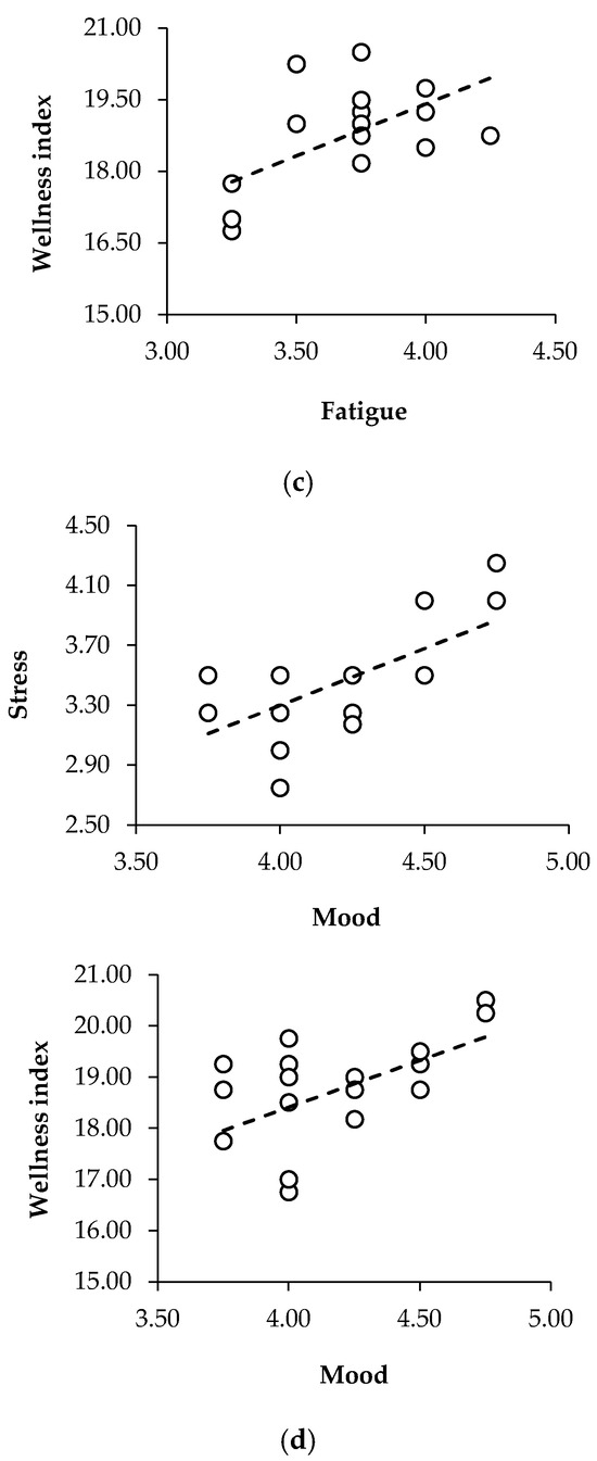 Several studies have explored the interplay between training intensity and wellness/well-being indicators in youth soccer contexts [12]. However, stronger associations have been identified between well-being outcomes and accumulated training loads, suggesting that the cumulative effects of training may have a more pronounced impact on players’ well-being [10]. Sleep quality, psychological stress, and fatigue are key indicators of how young players respond to intensive schedules such as tournaments. Moreover, sleep quality can serve as a valuable predictor of players’ stress levels, helping to identify those who may be at greater risk of psychological strain during congested fixture periods [13].