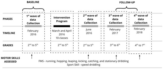 Then, the follow-up consisted of two new data collection waves. The first was executed in February 2017, with children enrolled in grades 3 to 6. After the data collection, all children were exposed to all PE classes designed by their PE teachers (without any intervention from the research team) for the remainder of the school year. Finally, to inspect a putative long-term effect of the intervention program on FMS performance (running and stationary dribbling) and SSS performance (basketball speed dribbling), a second data collection procedure was carried out in February 2018 with children in grades 4 to 7 of elementary school. In sum, the research project has four data waves of data collection—before (first wave) and after the intervention (second wave), and two follow-up measures (third and fourth waves).