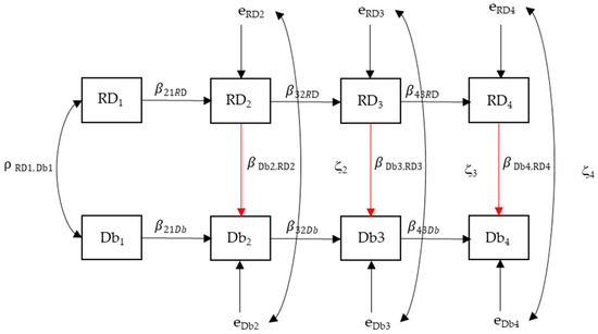In model 2 (Figure 3), the only difference is that there are no direct effects of RD on Db, but there are lagged effects. Hence, we hypothesize that irrespective of the specific auto-regressive effects describing changes within RD and Db, the main change in this model is that there is a delayed effect of RD developmental levels on Db: βDb2,RD1, βDb3,RD2, and βDb4,RD3.