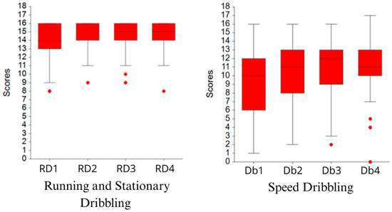 The Friedman test showed significant increases (χ2(3) = 26.72, p < 0.001) in running and stationary dribbling, as well as in speed dribbling (χ2(3) = 22.16, p < 0.001).
