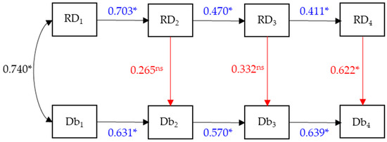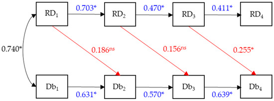 Similarly to the previous model, in model 2 (Figure 6), the measures of global fit are the same, as are the standardized autoregressive parameters (in blue) and the correlation (in black). Only the lagged effect (in red) from RD3 to Db4 is statistically significant (p < 0.05), whereas the other two are not (p > 0.05).