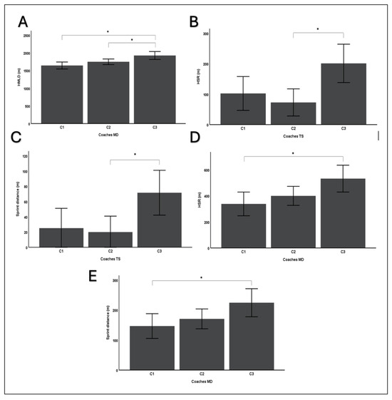 Significant differences were evident in HMLD for MD [F(2,27) = 7.59, p < 0.05], underlining a distinct higher intensity performance in this metric for the regime of C3. No significant differences were observed between the three coaches for the same metric during training sessions.