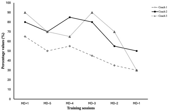 Lastly, our findings did not reveal a significant difference in the duration of the training sessions between the three coaches. Nevertheless, it was evident that the duration of the C3 training sessions, of an average of 60 min per session, was approximately 10% shorter than that of C1, with an average of 68.3 min per session. Recent research explains the importance of training duration, as prolonged training sessions can result in an increase in psychophysiological factors and can be detrimental to the physical objective on the specific training day [21]. The authors explain that this issue typically occurs due to an extended duration of disbursed drill instructions and miscommunication during tactical formations. Moreover, this could have also affected HSR and SD during training sessions. In the current study, C3 incorporated brief pre-training presentations 10 min before each training session to introduce the theoretical training objectives and structure for each drill. This could have resulted in the reduced overall duration during the training sessions of C3.