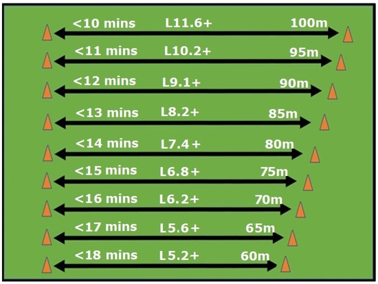 Example of an ability-based training session with distances (in meters) set by 2.4 km (1.5 mi) run times or 20 m Progressive Shuttle Run performance. Further groupings could be added as required.