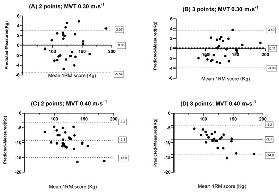 Bland–Altman plot results: (A) 2-point method in males with MVT of 0.3 m·s−1; (B) 3-point method in males with MVT of 0.3 m·s−1; (C) 2-point method in males with MVT of 0.4 m·s−1; and (D) 3-point method in males with MVT of 0.4 m·s−1.